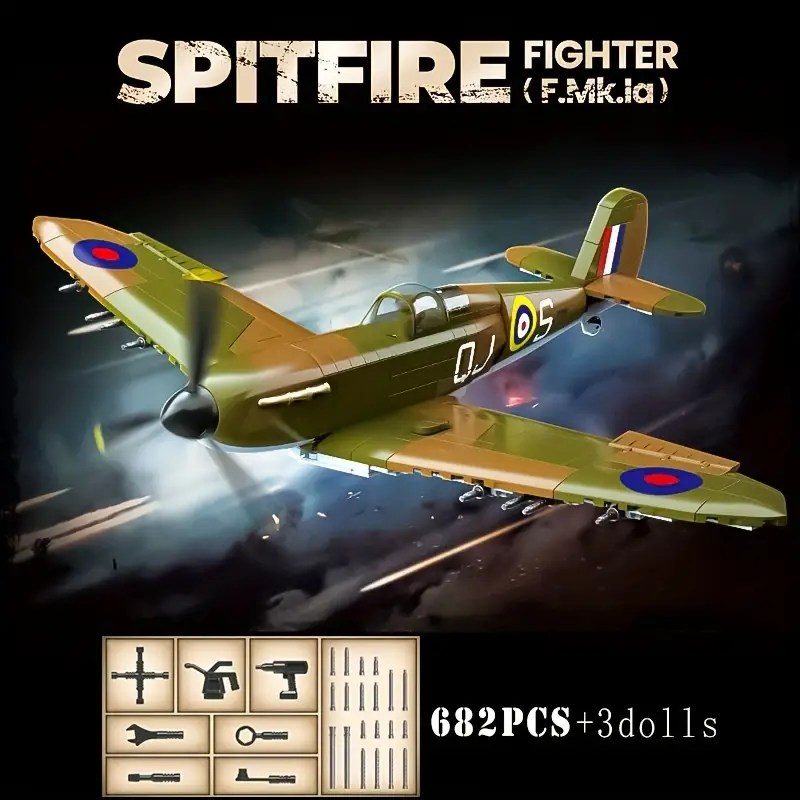 • This meticulously crafted set features a stunning replica of the iconic Spitfire plane, paying homage to its legendary role in World War II. Comprising 682 pieces, this kit offers hours of immersive building fun for both young aviation enthusiasts and seasoned collectors alike. Each detail of the Spitfire is faithfully recreated, from its sleek design to its intricate propeller and cockpit.
